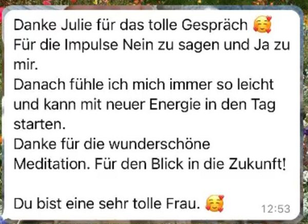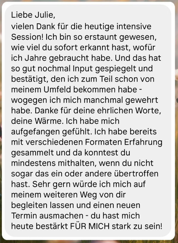 Schon damals konnte ich die Gefühle und Energien anderer Menschen wahrnehmen. Es war mir möglich, ihre innere Verfassung zu spüren und sie in schwierigen Situationen zu begleiten. Bereits als kleines Mädchen half ich meinen Mitmenschen, ihre eigene Kraft zu finden – ohne zu wissen, wie wertvoll und richtungsweisend diese Fähigkeit für mein Leben sein würde. 💫